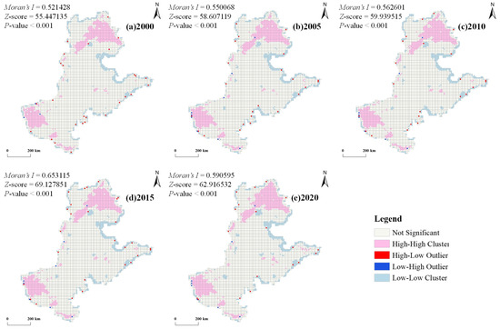 In the spatial autocorrelation analysis of carbon storage from 2000 to 2020 (as shown in Figure 9), the Moran’s I values for the Huang-Huai-Hai Plain across the five periods were all positive, specifically recording 0.521428, 0.550068, 0.562601, 0.653115, and 0.590595. This positive trend indicates a distinct spatial clustering effect in carbon storage across the periods in question. Notably, Moran’s I index rose from 0.521428 in 2000 to a peak of 0.653115 in 2015, followed by a minor retreat to 0.590595 in 2020. This overall ascending trend, with a slight dip in the final interval, suggests that the spatial clustering of carbon storage intensified over the two decades, with some variability noted in the last five years. The Z-scores for each year significantly exceeded the critical values of the standard normal distribution, and the p-values were nearly zero, which further substantiates the statistical significance of the observed autocorrelation.