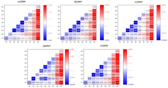 Results of Interactive Factor Detection. (Note: X1-X9 correspond to DEM, Slope, Aspect, Temperature, Precipitation, GDP, POP, NTL, NDVI).