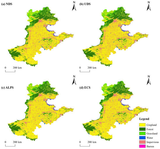 Spatial Distribution of Land Use in 2030 under Four Simulation Scenarios (NDS, UDS, ALPS, ECS).
