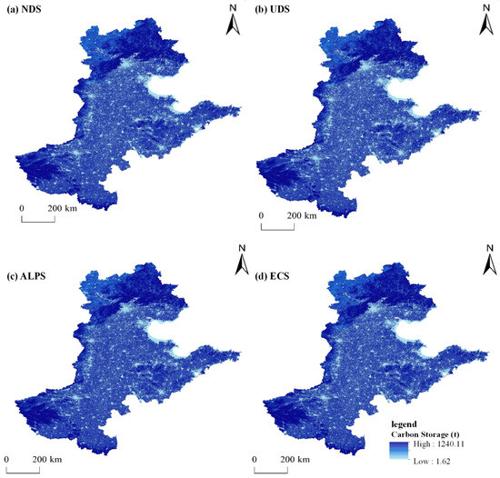 Under the four simulated scenarios, compared to 2020, the ALPS exhibited a minimal reduction in carbon storage, amounting to 70.91 million metric tons, followed by the ECS with a reduction of 115.81 million metric tons. The NDS experienced a decrease of 122.04 million metric tons, while the UDS experienced the most substantial decrease, with a reduction of 196.67 million metric tons.