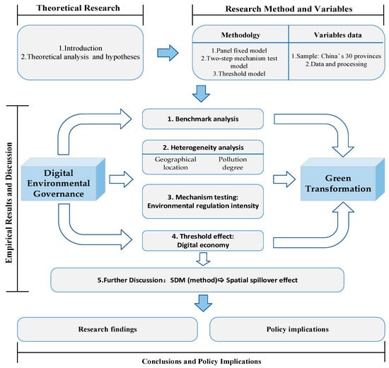 However, due to the complexity of environmental issues, the process of green transformation is not often instantaneous but rather a long-term endeavor influenced by multiple factors [1]. The strong negative externality of environmental pollution also determines the vital role of government-led environmental governance on green transformation. However, its impact is complex, which can have both positive effects in inhibiting pollution deterioration and promoting green transformation, as well as an adverse influence by exacerbating the pressure on enterprises for environmental compliance [5,6]. Currently, the deep integration of digital technology with government environmental governance has gradually transformed traditional governance toward digital environmental governance (DEG), introducing more uncertainty and complexity into the above influence. So, how will this emerging trend of DEG affect green transformation? What mechanisms are at play in this process? Are there any threshold effects and spatial spillovers? The answers to these questions play an important role in identifying the impact of DEG, resolving the dilemma of economic green transformation, and exploring novel paths for green digital development.