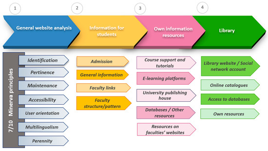 Evaluating websites is important given that their number is growing exponentially and that there are multiple sources of information for the same subject, and it is not possible to assess the quality and relevance of the information provided for each one. The Minerva project [23] has supported, since 2002, the ministries of culture of the European countries united in the Group of National Representatives for the digitization of cultural and scientific heritage in the publication of digital cultural content on the Internet and in improving its quality. Following the analysis of the information needs of digital users and the typologies and characteristics of digital cultural resources, ten quality principles were formulated, elaborated by Working Group 5. They were originally intended for the evaluation of the websites of museums, libraries, archives, or other cultural institutions, but they can be applied, partially or fully, to any websites—including university websites.
