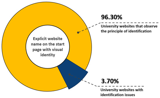 From the total number of the universities, 96.37% meet the identification principle, the website name being explicit and displayed on the host page: they have a visual brand identity, and, in addition, some faculties have their own visual identity, such as USAB(U46) and UNAP(U50)—in the case of these universities, in addition to the identity elements of the university, in many situations, the visual brand identity of the faculty also appears. The principle of identification is not observed in situations where the name of the university is not displayed on the host page, the visual identity of the website is not clear, and the mission and objectives of the university or other clear elements that contribute to the unique and unambiguous identification both of the website and implicitly of the university are not specified.
