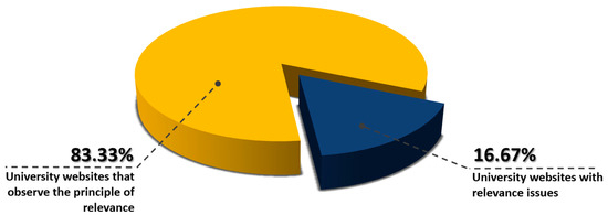 Among the 54 university websites analyzed, only 45 university websites, representing 83.33%, meet the principle of relevance. The information on the website is correct, and the internal and external links direct the user to the expected information. Nine of the state universities do not have websites that fully meet the relevance criterion. The principle of relevance is not observed in situations where the published information is not verified, is not accurate, and the resources are not properly documented and are not clearly identifiable, the needs of the users are not known, and the selection of contents does not reflect the needs of the target audience (Figure 4).