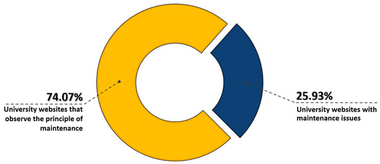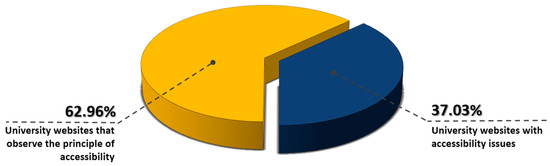 Among the 54 university websites analyzed, only 34 of them observe the principle of accessibility, representing 62.96%. During the data collection period, it was observed that not all university websites were permanently accessible in their integrity. There were situations when the whole site was not accessible or only certain pages or applications (Figure 6).
