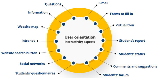 After analyzing the university websites, the possibilities offered by them to a user to get in touch online with all the university offices, as well as the possibilities of interactivity via email, social networks, and contact forms were verified. The principle of user orientation is not observed in situations where users are not offered opportunities to intervene, through relevant and documented opinions, in the development of the website’s structure and in the formulation of their own information and documentation needs (Figure 7).