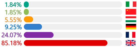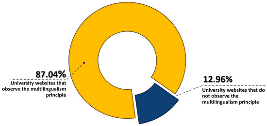 Among the 54 university websites analyzed, 47 (representing 87.04%) university websites have content translated into at least one language. Among the university websites with content translated into more than two international languages are UTCN(U17), UBBCN(U19), UMC(U24), UC(U25), UDG(U27), and UAIC(U30) (Figure 9).