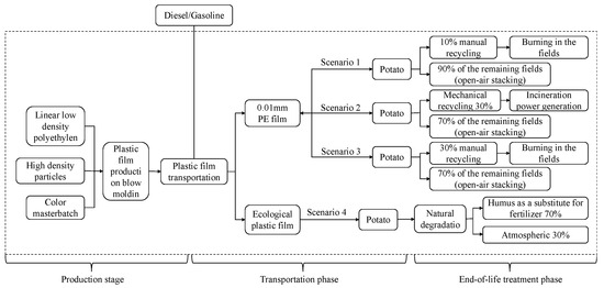 To analyze the environmental effect of two different plastic films made in China, we focus on 0.01 mm PE film from Anhui Fengyuan Group Co., Ltd., Bengbu, China and ecological plastic film from Suzhou Zhongke Derun Environmental Governance Co., Ltd., Suzhou, China. Their basic properties are summarized in Table 1.