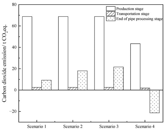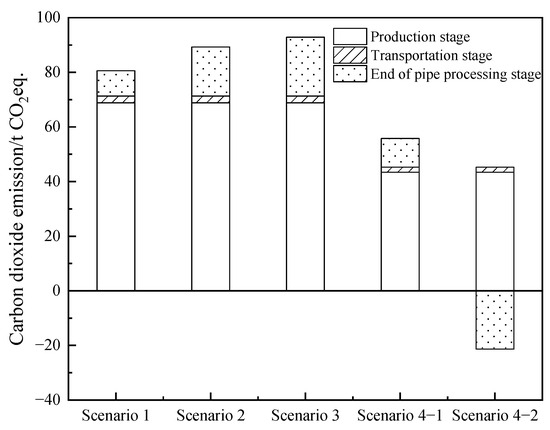 Carbon dioxide emissions generated at different stages of the life cycle of four scenarios.