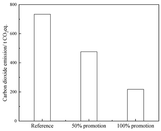 According to the research, the cultivated land area in Qingcheng Town is 1821 hm2. Each piece of cultivated land in the experimental field measures 200 hm2. Thus, the experimental field accounts for approximately 10.98% of Qingcheng Town’s total cultivated land area, representing an increase of 9.105 times. Using the basic data from Scenario 1 and Scenario 4-2 in Figure 3, we reference Scenario 1 at 100% application. The CO2 emissions are calculated for production, transportation, and end-of-pipe treatment, based on a 50% application of simulated ecological plastic film in both scenarios and a 100% application in Scenario 4-2.