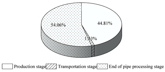 For the 50% application of ecological plastic film, carbon reduction contributions were analyzed across three stages. The final treatment stage contributed the most, followed by the production stage and transportation stage, with reductions of 139.26 t, 115.45 t, and 2.91 t, respectively. The percentage contributions were as follows: final treatment stage (54.1%), production stage (44.8%), and transportation stage (1.1%), as shown in Figure 5.