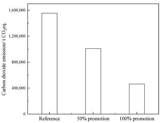 Figure 6 illustrates the total CO2 emissions resulting from the promotion of ecological plastic film usage on 50% and 100% of cultivated land in Shanxi Province. Using a reference of 0.01 mm PE film, the total life cycle CO2 emissions for the film amounted to 1,555,520.2 t. With 50% of cultivated land using ecological plastic film, CO2 emissions totaled 1,009,182.7 t. In the case of 100% land coverage, emissions decreased to 462,823.9 t.