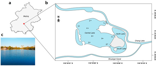 (a) Location of Central Lake in Zizhuyuan Park with respect to Beijing, (b) collection sites for samples from Central Lake in Zizhuyuan Park, and (c) surrounding environment map of Central Lake in Zizhuyuan Park.