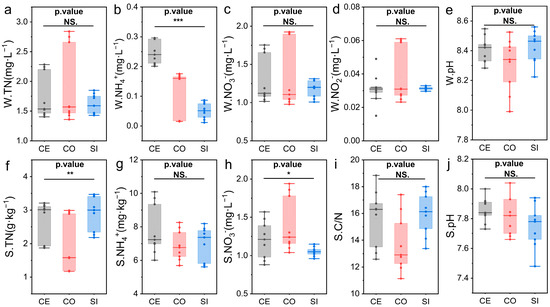 Comparison of water and sediment physicochemical properties in the three locations (CE, CO, and SI) in Central Lake. Significance is indicated by * p < 0.05, ** p < 0.01, and *** p < 0.001, NS: no significant difference. (a) TN contents of water, (b) NH4+ contents of water, (c) NO3− contents of water, (d) NO2− contents of water, (e) pH of water, (f) TN contents of sediment, (g) NH4+ contents of sediment, (h) NO3− contents of sediment, (i) C/N ratio of sediment, and (j) pH of sediment. Abbreviations: W.TN, total nitrogen contents of water; W.NH4+, NH4+ contents of water; W.NO3−, NO3− contents of water; W.NO2−, NO2− contents of water; W.pH, pH of water; S.TN, total nitrogen contents of sediment; S. NH4+, NH4+ contents of sediment; S.NO3−, NO3− contents of sediment; S.C/N, total organic carbon/total nitrogen ratio of sediment; S.pH, pH of sediment.