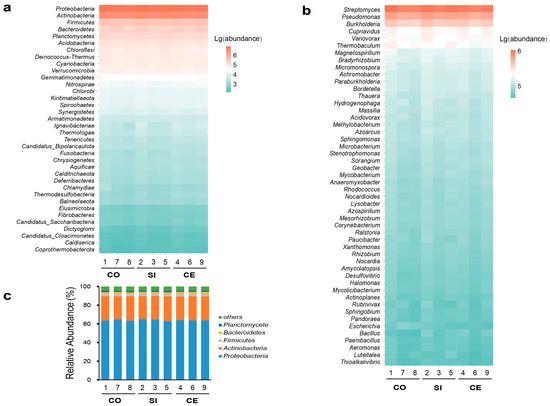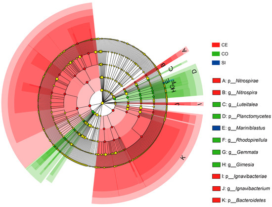LEfSe analysis indicated that, at the phylum level with LDA > 2 (Figure 5), Nitrospirae, Ignavibacteriae, and Bacteroidetes differed significantly (p < 0.05) at the CE, and Planctomycetes differed significantly (p < 0.05) at the CO. At the genus level, Nitrospira and Ignavibacterium were significantly different (p < 0.05) at the CE; Mariniblastus was significantly different (p < 0.05) at the SI; and Luteitalea, Rhodopirellula, Gemmata, and Gimesia were significantly different (p < 0.05) at the CO.