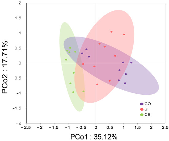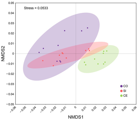 NMDS analysis of the microbial community in three different areas, namely CO, SI, and CE.