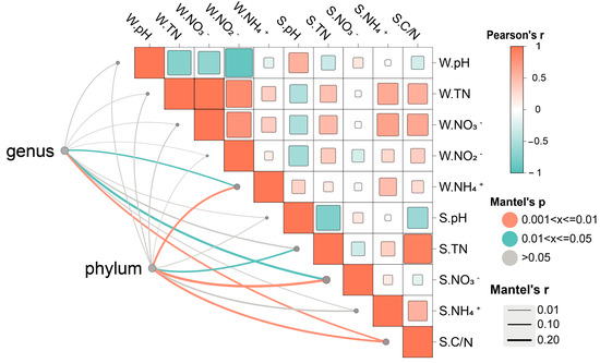 The Mantel test revealed the impacts of various environmental conditions on the microbial community (Figure 6) [44]. At the genus level, the microbial community was significantly correlated with the NO3− (p < 0.05) and C/N ratio (p < 0.001) in the sediments and with NH4+ in the lake water (p < 0.05). At the phylum level, the microbial community was significantly correlated with the TN (p < 0.05), NO3− (p < 0.001), and C/N ratio (p < 0.001) in the sediments and with NH4+ in the lake water (p < 0.001).