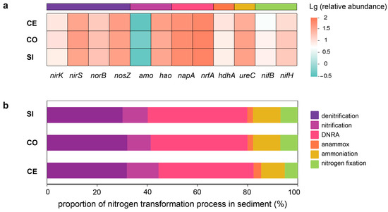 Average relative abundance of each type of nitrogen functional gene (a) and the contribution of each nitrogen transformation process (b).