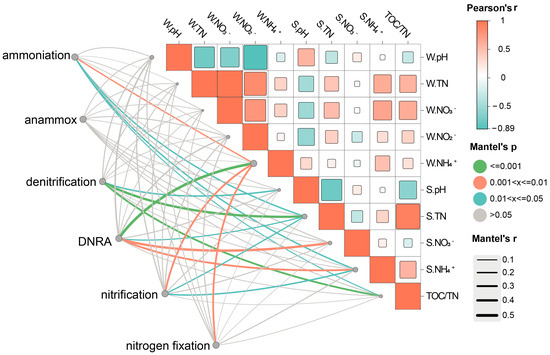 The Mantel test was employed to analyze the impacts of many environmental elements on nitrogen transformation processes (Figure 9). In Central Lake in Zizhuyuan Park, environmental factors, such as the NH4+ concentration of the water, the pH, the contents of TN, NO3−, NH4+, and the C/N ratio in the sediment, significantly influence nitrogen transformation processes. Ammoniation was affected mainly by the NH4+ concentration of the water (r = 0.18, p = 0.009), the TN concentration of the sediment (r = 0.20, p = 0.016), the NH4+ concentration of the sediment (r = 0.20, p = 0.032), and the C/N ratio (r = 0.12, p = 0.04). Denitrification was influenced by the pH of the sediment (r = 0.22, p = 0.014), the TN concentration (r = 0.40, p = 0.001), and the C/N ratio (r = 0.28, p = 0.001). DNRA was affected by the NH4+ concentration of the water (r = 0.47, p = 0.001), the TN of the sediment (r = 0.15, p = 0.042), NO3− (r = 0.39, p = 0.002), and the NH4+ (r = 0.30, p = 0.003). Nitrification was influenced by NH4+ in the water (r = 0.30, p = 0.002), TN in the sediment (r = 0.16, p = 0.019), and NH4+ (r = 0.21, p = 0.028). Nitrogen fixation was influenced primarily by the NH4+ concentration of the water (r = 0.29, p = 0.004).