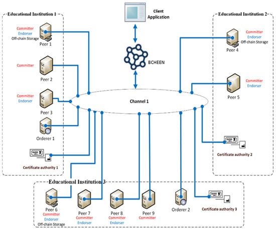 BCHEEN was designed so it can work on a Hyperledger Fabric network. Figure 1 shows how BCHEEN deployment environment would look like. The Hyperledger Fabric network, in which BCHEEN will operate, is both formed and managed by the multiple educational institutions that contribute resources to it. The network literally does not exist without these resources. Furthermore, the network shrinks and grows with the resources that are contributed by the participating institutions. Each institution would provide a different number of peers, depending on the institution’s size and number of students. A small educational institution, such as Institution 2 in our example, would contribute fewer peers than a bigger institution like Institution 1. These peers form the basis of the network, hosting ledgers, and chaincodes which can be queried and modified by applications. They also store students’ large data that is kept off-chain. By default, each peer in the network has the role of committer i.e., committing the blocks which it receives from the ordering service to its own ledger. In addition to this, a peer can act as endorser, i.e., endorsing transaction requests that come from clients. In our example, peers 1, 3, 4, 5, 7, and 8 are both committers and endorsers, while Peers 2, 6, and 9 are only committers.