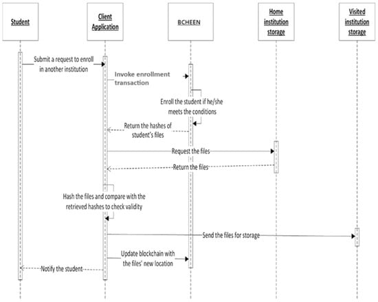 Replicating students’ files is managed by a client application that will be built on top of BCHEEN. As can be seen in Figure 2, when a student submits an enrollment request, the client application invokes the enrollment transaction in the BCHEEN. As a result, BCHEEN executes the transaction. If the student meets all the enrollment conditions, he/she is enrolled in the visited institution, and the hashes of his/her files are returned to the client application. The original files are then retrieved from the storage space of the home institution and their hashes are computed and compared with the ones received from BCHEEN. If the hashes are the same, this proves that the files have not been changed. The client application will then update BCHEEN with the new location of the files on the visited institution storage space.