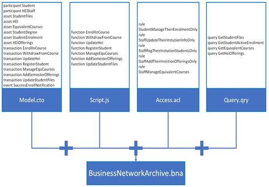 BCHEEN was implemented according to Hyperledger Composer architecture (see Figure 3). Four files were created: a model file (Model.cto), a script file (Script.js), an access-control (Access.acl), and a query file (Query.qry). The model file defines the participants, the assets, the transactions and the events of BCHEEN. The script file contains the implementation of the seven transactions that have been defined in the model file. The access control contains rules that control what resources or assets a student or a staff member is authorized to access or perform in BCHEEN. The query file contains four queries. Each query was designed to be invoked by a transaction to retrieve some assets.