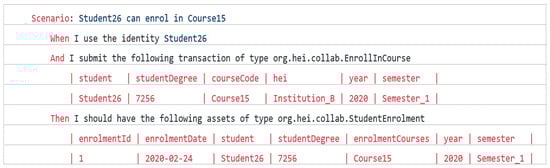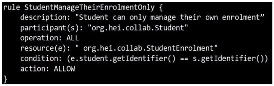 Access to resources or assets of BCHEEN is secured through access rules. Students and staff members will typically transact from inside their institutions, and each will have different access control requirements on the ledger, whilst at the same time will have the same access privileges to some shared data. Five rules were defined in BCHEEN. The first one is called StudentManageTheirEnrolmentOnly (see Figure 4). It allows students to manage their own enrollments only, i.e., read, create, and update their enrollment assets. It checks if the student id of the participant who is trying to transact is similar to the student id inside the enrollment asset. If so, the student will obtain full access to the enrolment asset; otherwise, the transaction will be denied.
