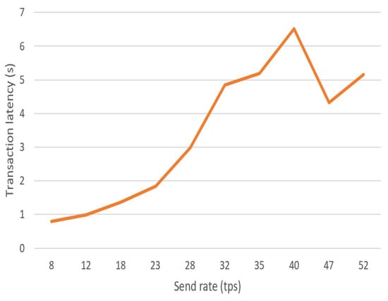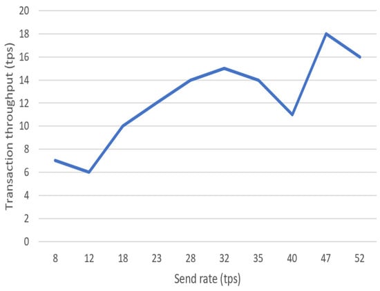 The performance evaluation of BCHEEN highlights its scalability and efficiency. The platform achieved a peak throughput of 18 tps at a send rate of 47 tps, with an average latency of 4.32 s under the same conditions. These results are comparable to the average performance reported for similar Hyperledger Fabric platforms [,]. For example, Nasir et al. [] observed a transaction latency of 3.5 s with a throughput of 15 tps under similar conditions. Melo, Gonçalves, Silva and Soares [] evaluated a Hyperledger Fabric deployment and reported latencies ranging from 2.8 to 3.6 s with a throughput of up to 20 tps. Additionally, Tanwar, Parekh and Evans [] measured transaction latencies of 3.2 to 4.0 s on a permissioned blockchain system optimized for healthcare applications. Overall, the performance results of BCHEEN are consistent with these reported benchmarks, demonstrating its reliability and scalability for high-volume institutional collaborations.