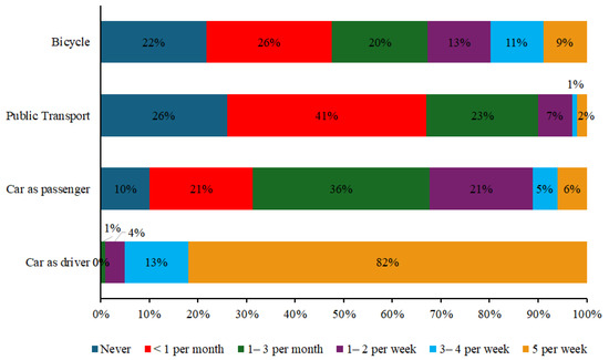 Figure 3 shows that the percentage of drivers commuting in their own cars can be as high as 82%. In Poland, 66% of drivers use their own car to travel to work, with this percentage rising to 80% for employees with children—confirming the results of the survey shown in