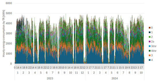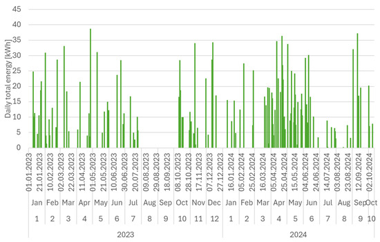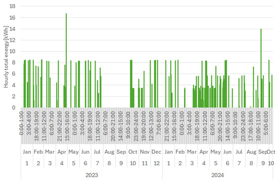 Figure 5 presents the hourly energy consumption for the same EV charging station. Based on the amplitude of this characteristic, it can be inferred that typically, one or two electric cars were charged simultaneously, and on two occasions, more than two vehicles were charged at the same time.