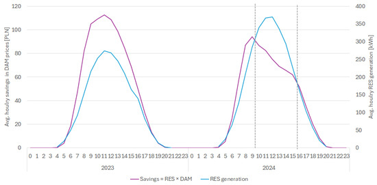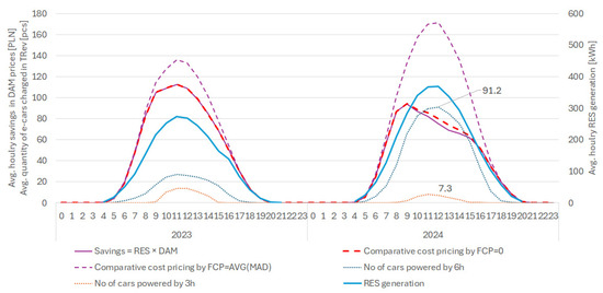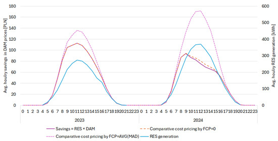 | Year 1 | Savings = SUM (RES × DAM) [PLN] | Comparative Cost Pricing by FCP = 0 [PLN] | Comparative Cost Pricing by FCP = AVG(MAD) [PLN] | Delta to CCP by FCP = 0 | Delta to CCP by FCP = AVG(MAD) |