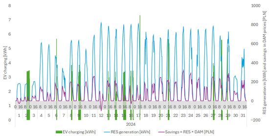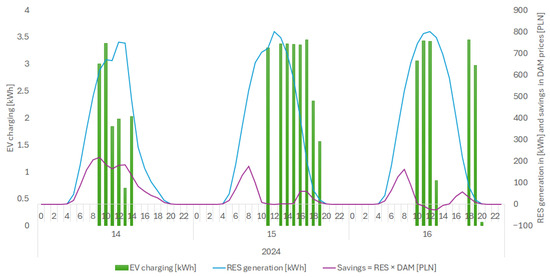 RES generation, its income by DAM prices, and EV charging data at 14–16 May 2024.