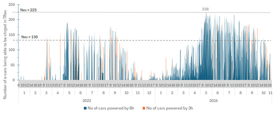 Daily RES energy availability in the TRev power mode, calculated for maximum FCP = AVG(MAD), shown as the number of e-cars that can be powered for at least 6 or 3 h.