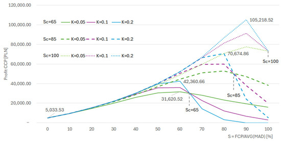 The CCP model profit scenarios for 2024, estimated for various decisions by the company’s employees in response to the charging price FCP in relation to the average electricity price on Fixing I (DAM); K is the slope parameter, and Sc is the inflection point of the penalty function transition curve (13).