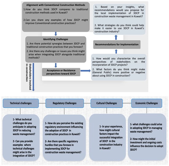 The interview process was structured into seven sections covering various aspects, including technical, regulatory, cultural, and economic challenges. Additional sections explored the alignment of 3DCP with established construction methods, Perspectives toward 3DCP, and recommendations for local implementation. These structured interviews allowed for a comprehensive exploration of diverse facets within the context of 3DCP in construction waste management in Kuwait. Table 2 presents the background of the participants; purposive sampling was used to recruit participants, 33 participants, including 3 engineers from PAHW, 4 municipality engineers, 2 from recycling companies, 4 consultants, and 20 general public. Figure 2 illustrates the interviewee’s questions.