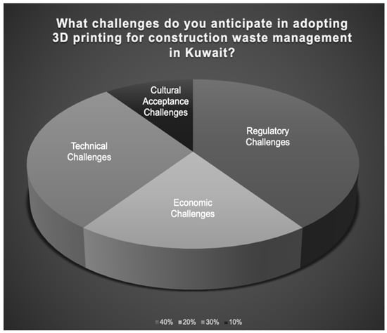 Adopting 3DCP for construction waste management in Kuwait faces several challenges, with regulatory hurdles being a significant concern, accounting for 40% of the difficulties, as shown in Figure 3. The absence of regulatory frameworks specifically tailored for 3DCP in construction presents a major obstacle. Established standards and regulations are crucial for setting operational and management benchmarks, ensuring quality and safety, and minimizing risks associated with skill and product instability.