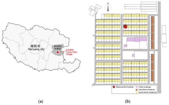 Yunyu New Village is located in Taihe Town, Sheqi County, Nanyang City, Henan Province, China. The relocation task in this village was completed in 2011. It is one of the typical newly built immigrant resettlement areas of the South-to-North Water Diversion Project. There are 505 permanent immigrants. The overall shape of the village is relatively regular. The total area of homesteads in the village is approximately 31,200 square meters. The location and master plan of the village are shown in Figure 2. Most of the buildings in the resettlement area are oriented in the north-south direction. The buildings on the east side facing the highway are oriented in the east-west direction. There are several public service buildings and sites in the central area.