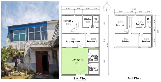 Because most buildings in the resettlement area are oriented north-south, the test sample was selected as a typical north-south-oriented apartment. The names of the rooms and the bedroom numbers in the right building plan in Figure 3 are shown. The building is a two-story brick-and-mortar structure with a wall thickness of 240 mm. The walls are plastered on both sides, and the roof is covered with cement mortar tiles. There is a single-layer iron gate and aluminum alloy sliding window as well as an iron grille on the outside. The floor-to-ceiling height is approximately 3.5 m. The ground floor of the building has a living room, a kitchen, two bedrooms, and a bathroom. The second floor has three bedrooms, a bathroom, and a balcony above the living room, and the southern side of the building has an outdoor area of approximately 70 m2. There is an actual courtyard addition, with a utility room and a kitchen.