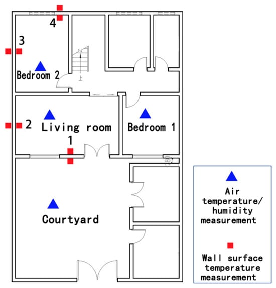 The test time for the surface temperature of the building walls was 10:00–18:00 on 21 January 2024. The measurements were taken every two hours, three points were averaged for each measurement, and the corresponding internal and external test points were measured within 10 min. The measurement object was the external wall of the survey building. The measurement points are shown in Figure 4. The measurement instrument used was a TM902C thermocouple electronic thermometer.