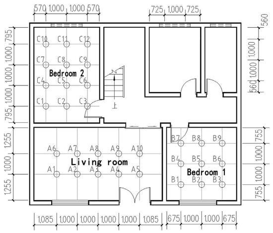 The indoor light environment test time of the resettlement house was 9:00–18:00 on 17 September 2023. It was sunny during the test period. Measurements were taken every hour. The test objects are the main rooms on the first floor, namely, the living room, bedroom 1, and bedroom 2. In accordance with the “Day-lighting measurement method” GB/T5699-2017 [29], the measurement height is 750 mm away from the ground, and the specific point layout is shown in Figure 5.