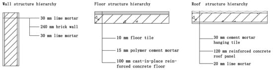 We use EnergyPlus software (V9-0-1) to simulate building energy consumption. The thermal conductivity, specific heat capacity, and dry density of the main building materials are determined in combination with the physical performance calculation parameters of the building materials given in the Code for Thermal Design of Civil Buildings of China (GB50176-2016) [30], as shown in Table 2. The wall is composed of lime mortar, brick walls, and lime mortar; the floor is composed of floor tile, polymer cement mortar, and a cast-in-place reinforced concrete floor; and the roof is composed of cement mortar hanging tile, a reinforced concrete roof panel, and lime mortar. The construction material layers of the building envelope are shown in Figure 6. According to the actual situation and living habits of the resettlement area, the personnel included two people, an elderly man and a young man. The young man has farm work or temporary work from 08:00 to 12:00 and from 14:00 to 19:00. The old man performs simple housework in the living room from 08:00 to 19:00, walks from 19:00 to 20:00, and rests from 20:00 to 08:00 in the bedroom. The heating and cooling room is set as the first-floor living room and two bedrooms. Other parameters, such as the floor plan, building height, and window-to-wall ratio, are set according to the actual situation. The summer design day is 21 July, and the winter design day is 21 January.