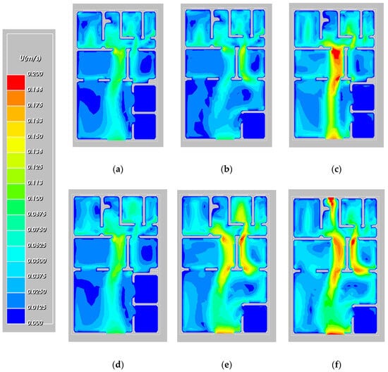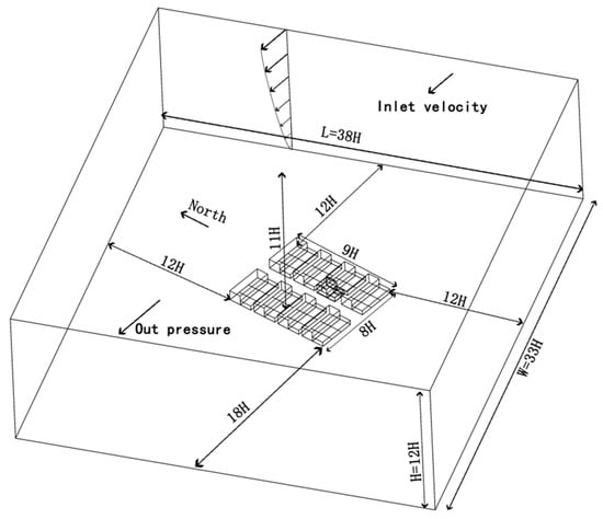 For indoor ventilation, the Gbsware software VENT 2022 is used. The simulated ventilation time was set as summer. Considering the shielding of the surrounding buildings to the sample buildings, the overall resettlement area is modeled and simulated according to the actual situation. The arc division accuracy is 0.24 m, the initial grid size is 0.8 m, the minimum and maximum subdivision series are 1, the minimum iteration number is 200, and the number of grids is 223,855. According to the Design Code for Heating Ventilation and Air Adjustment of Civil Buildings (GB50736-2012), the average outdoor wind speed in Nanyang is 2.7 m/s, the wind direction is 22.5° (ENE), and the rough ground index is 0.16. The calculation domain of the summer conditions is 349.5 m, the width is 305.4 m, and the height is 108 m. The main building environment around the survey building is shown in Figure 7, where H is the maximum building height.