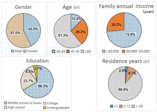The personal information statistics of the respondents are shown in Figure 8. The gender composition of the respondents is basically balanced, among which women (57.5%) are more common than men (42.5%); those over 60 years of age account for 61.3%, and those over 45 years of age account for 87.5%, indicating that the resettlement area has a serious aging problem; middle school and below account for 66.3%, and only 10% are above college, indicating that the interviewed immigrants have a low education level; those who have lived for 10 years or more account for 88.8%, indicating that most of the respondents are permanent residents of the resettlement area; and the annual average income of the respondents’ family members is less than 50,000 yuan, of which those below 30,000 yuan account for 73.8%, indicating that the immigrants in the resettlement area have a low income. According to the survey interviews, most immigrants have no direct source of income. Most young people leave to work, and those left behind are more often older. This finding also shows that the currently surveyed resettlement area is in decline.