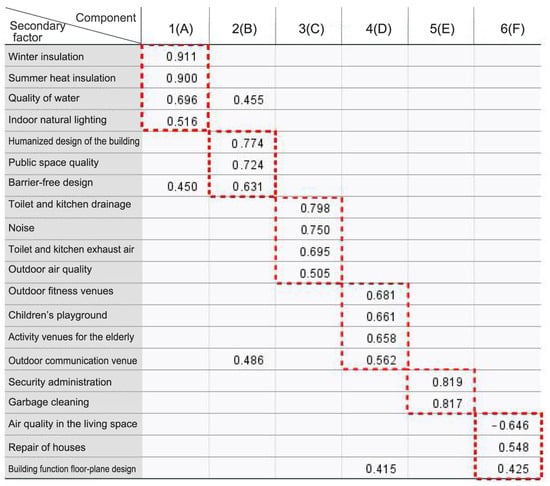 According to the rotating component matrix, as shown in Figure 9, the secondary factors are re-integrated on the basis of load values (if a secondary factor has load values in two components, the larger the load value is taken, as the larger the value is, the higher the correlation with the corresponding component). Six new categories as suggested components are then summarized: A–F. Category A has the highest contribution rate of variance (27.503%). More results of the factor analysis are shown in Table 5.