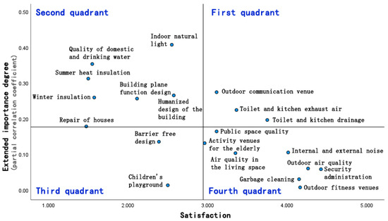 The IPA analysis diagram is shown in Figure 10. The secondary factors in the second quadrant (important improvement area) include winter insulation, summer heat insulation, drinking water quality, indoor natural light environment, humanized design, and building functional layout. Therefore, these factors are the focus of improving the living environment in the resettlement area and need to be prioritized for renovation.