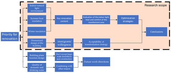 The current situation of winter insulation, summer heat insulation, and the natural lighting environment needs to be further verified through on-site measurements to obtain sufficient data for research and future renovation strategies. Humanized design requires sufficient research on the willingness of immigrants. Owing to the need to coordinate with relevant departments, such as the government and water companies, to improve the quality of drinking water, and because the government and immigrants temporarily do not afford large-scale renovation of buildings, the “quality of domestic and drinking water” and “building plane function design” are not included in the discussion of this paper. The research framework is shown in Figure 11.