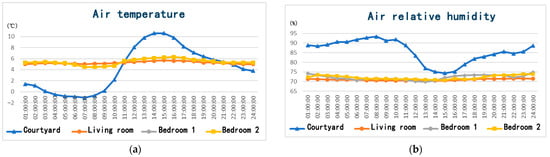 This is because although the living room and bedrooms have doors and windows facing outdoors, owing to the immigrants’ need for heat preservation in winter, the doors and windows are often closed tightly. There is almost no wind near the doors and windows at the entrances of the measured living room or bedrooms, which also shows that the air-tightness of the doors and windows is good and that the heat loss from ventilation in winter is small. At 14:00, when the solar radiation is strong, there is no obvious change in the temperature of the living room or bedrooms. The living room is shaded by trees in the courtyard, bedroom 1 is shaded by an additional building in the courtyard, and bedroom 2 is north-facing and has no direct sunlight all day. Therefore, the surveyed building has less direct solar radiation heat gain in winter.