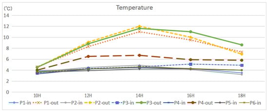 Combined with the wall surface temperature, although the outer wall temperature is constantly changing, the inner wall temperature can basically maintain a relatively stable state. Figure 13 shows that the thermal insulation performance of the building envelope is good. However, the inner wall temperature is 1–2 °C lower than the indoor air temperature, indicating that heat is continuously output from the indoors to the wall in winter.