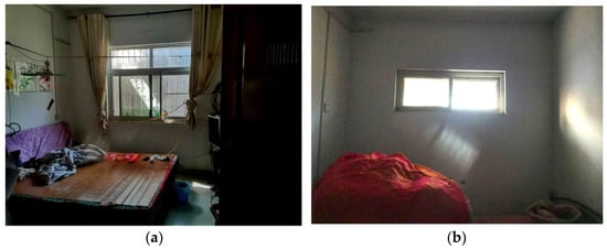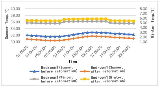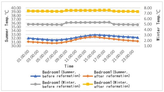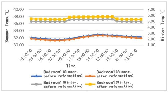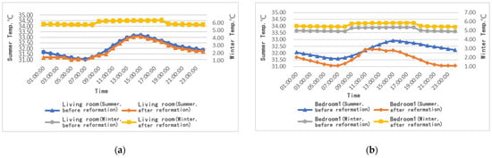 According to the “Energy-saving Design Standard for Rural Residential Buildings” (GB/T 50824-2013), in hot summer and cold winter areas, the indoor calculation temperature of the main functional rooms such as bedrooms and living rooms of rural residential buildings should be 8 °C in winter and 30 °C in summer without any heating or air conditioning measures [31]. The temperatures of the living room and two bedrooms of the surveyed building are 5–6 °C on a typical winter day, and the temperatures of the living room and bedrooms of the surveyed building are 32–33 °C on a typical summer day, which do not reach the calculated temperature of the energy-saving design standard.