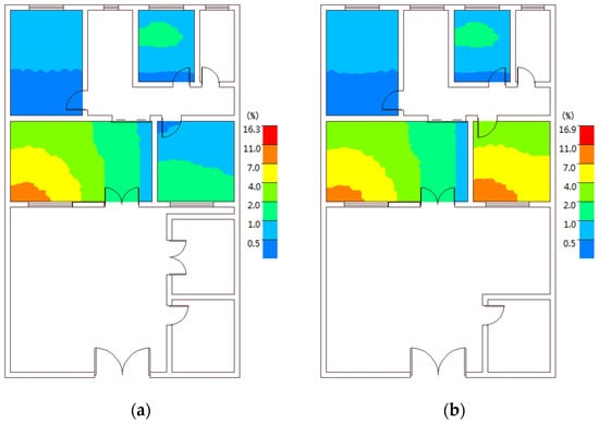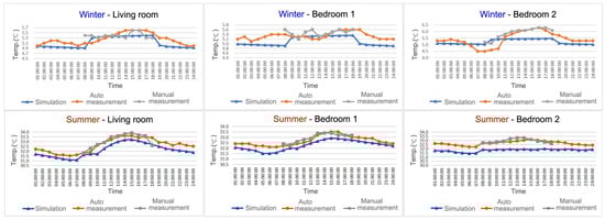 On the typical winter day measured, the outdoor temperature reached a maximum value of 10.9 °C at approximately 15:00 and a minimum value of −1.2 °C at 6:00, with a temperature difference of nearly 12 °C, whereas the temperature difference between the living room and the two bedrooms was relatively small, within 1 °C. For relative humidity, the outdoor humidity reached a maximum value of 93.4% at approximately 8:00 and a minimum value of 74.4% at approximately 15:00, with a difference of nearly 20%, whereas the humidity difference during the day in the living room and the two bedrooms was relatively small, within 5%. Although the outdoor temperature and humidity fluctuate greatly, the indoor temperature and humidity can maintain a relatively stable state. See Figure 12.